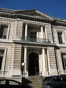 The remainder of the facade is similarly ornate. Each corner of the facade contains pilasters with quoins, similar to those surrounding the portico. The windows at the ground floor are surrounded by banded moldings and have balustrades at the bottom. The balustrades of each ground-story window are visually connected by band courses within the spaces between each window. On the second story, each window is surrounded by a banded molding and has a wrought-iron window guard at the bottom, as well as a carved swag atop the window. The spaces between the windows on both stories are made of stone panels in low relief, while a band course separates the floors horizontally. The facade is topped by a large entablature and a cornice supported by modillions.[4][20] The entablature has talon and egg-and-dart moldings as well as a blank frieze; at the portico, the entablature projects slightly from the facade.[20]
