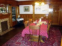 Lumberman Simmons' utilized oak extensively throughout the house. Features include a built-in oak china cabinet, carved oak newel posts, dentil molding, extensive oak panels, oak pocket doors, and oak flooring.