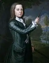 James Bowdoin II was born in Boston to Hannah Portage Bowdoin and James Bowdoin, a wealthy Boston merchant.[2] His grandfather, Pierre Baudouin, was a Huguenot refugee from France. Pierre took his family first to Ireland, then to eastern Massachusetts (present-day Maine), before finally settling in Boston in 1690.[3] James Bowdoin I had a modest inheritance from his parents, but greatly expanded his father's merchant business and land holdings to become one of the wealthiest men in the province.[2][4] Young James attended the South Grammar School (now Boston Latin School), then graduated from Harvard College in 1745. When his father died in 1747, he inherited a considerable fortune.[5] He married Elizabeth Erving, sister of his Harvard roommate, in 1748.[6] They had two children.[4] That same year, he received his master's degree from Harvard.[7]