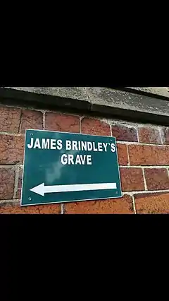 James Brindley died at Turnhurst on 27 September 1772.[4][5] He was buried on 30 September, just nine days after the completion of his Birmingham Canal, at St. James in Newchapel in Staffordshire, England. The commemorative plaque (1956) at the church shows his date of death as 25 September. The inscription on his grave reads "James Brindley, of Turnhurst, engineer, was interred 30 September 1772, aged 56."[6]