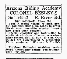- ↑ "Arizona Riding Academy". The Tucson Daily Citizen. Tucson, Arizona. 21 November 1950. Retrieved 2 March 2019.