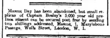 - ↑ "Mascot Day Has Been Abandoned". The North Wales Chronicle and Advertiser for the Principality. Bangor, Gwynedd, Wales. 17 August 1917. Retrieved 14 October 2019.