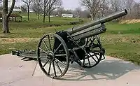 However higher political office wasn't in Colonel Rieger's plans. Other than serving as a special judge when asked, he was mostly content to live a quiet life as a small-town lawyer. In 1938 Rieger returned to France at the behest of Missouri Governor Lloyd Stark as part of a three-man commission to inspect the gravesites of fallen Missourians.[1] It was also in 1938 a new Missouri National Guard armory was constructed in Kirksville and was named Rieger Armory in his honor. Two other vestiges of his military service remain in the town as well. While overseas Rieger obtained several pieces of stained glass from a bombed-out cathedral in Verdun, France. These were shipped to Kirksville and fashioned into a window for the First Baptist Church, where the Colonel served as a deacon. A grateful War Department also granted Kirksville a German howitzer captured by the 35th Division during the fighting near Charpentry, France. It serves as a sentinel for the memorial to servicemen and women from Adair County, Missouri.[2] James E. Rieger died July 1, 1951, in Kirksville and is buried in that city's Highland Park Cemetery.