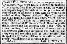 In 1842, Purvis placed an ad in the newspaper declaring that "The subscriber, having quit the Trade entirely, offers for sale his establishment on Harford Avenue. Persons wishing to purchase will please make early application to the undersigned, as he is desirous of closing his business in this country immediately."[26] The advertisement appeared in a newspaper of Richmond, Virginia, rather than in a Maryland paper, no doubt because, as of 1842, Richmond's Shockoe Bottom hosted the largest and most important slave market in the Upper South.[27]