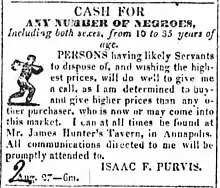 Isaac F. Purvis (c. 1813 – June 24, 1843) was James F. Purvis' younger brother and an American slave trader who worked around Annapolis, Maryland for several years in the 1830s. Purvis was born about 1813,[59] probably in Tennessee. In addition to working with his brother and uncle, Purvis was associated with George Kephart of Frederick County, Maryland and later Alexandria, Virginia.[60] In 1835 he ran a number of newspaper ads seeking to buy "any number of negroes, including both sexes, ages 10 to 35 years of age." He could regularly be found at Mr. James Hunter's tavern in Annapolis.[61] By 1838 James Hunter tavern had become "Mrs. Hunter's tavern" and "any communications left with John Lamb" would be promptly attended to.[62] Circa 1841, anyone wishing to sell people to James F. Purvis was encouraged to seek out his brother at the Eagle Hotel in opposite the B&O Railroad depot in Baltimore.[10] Isaac F. Purvis died at age 30 in 1843; the funeral was held at his brother's home on Hanford Avenue.[59]