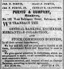 - ↑ "Howard Bank - resignation of James F. Purvis". The Baltimore Sun. April 19, 1867. p. 1. Retrieved 2024-01-02.