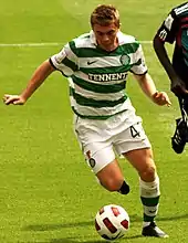 Forrest played in all of Celtic's matches in the Europa League qualifiers and group stage. He scored against Dunfermline and won the SPL Young Player of the Month award for November, his second of the season.[25][26] In January 2012, Forrest was named one of the 13 players to watch in 2012 by world football governing body FIFA.[27] He scored against St Mirren and Dunfermline[28][29] before his season ended after suffering an injury during Celtic's defeat to Kilmarnock in the 2012 Scottish League Cup Final.[30] He finished the season having scored 9 goals and made 7 assists in 43 appearances and won his second major honour at the end of the season when Celtic finished as SPL Champions.[31] His form over the season also saw him win two personal awards as both the Scottish Football Writers' Association and Professional Footballers' Association Scotland voted him their respective Young Player of the Year as well as being named in the PFA Scotland SPL Team of the Year.[31][32]