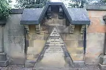 He is buried with his first wife, Elizabeth Mitchell, in the Grange Cemetery in Edinburgh.[2] The grave lies against the north wall and is designed in Gowan's distinctive style. His second wife outlived him and is buried in Dean Cemetery, Edinburgh with her father.