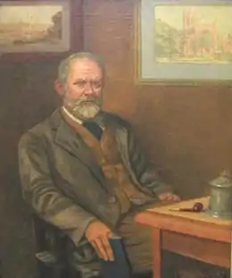 A posthumous portrait of Hall, painted by his son Walter J. Hall, was presented to the town of Nantwich in 1943. It formerly hung in the Free Library and is now displayed in the main gallery of Nantwich Museum.[1][14] The portrait depicts him sitting in front of two pictures of churches, Lincoln Cathedral and St Mary's Church, Nantwich.[1] At this time, Walter Hall wrote four biographical articles, published in the Nantwich Guardian in 1944 and subsequently collected into a brief biography by J. Lodge, headmaster of Nantwich and Acton Grammar School.[14] He is also commemorated by a tablet in the porch of St Mary's Church, erected in 1946, the centenary of his birth, by Percy Corry, also a local historian. It describes him as "The Historian of Nantwich."[1] A street in Nantwich is named for him.[15]