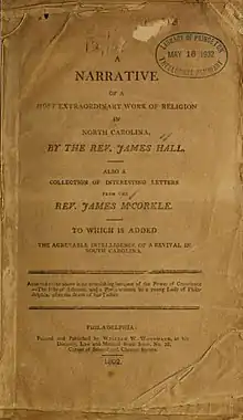 - 1 2 Hall, James (1802). A narrative of a most extraordinary work of religion in North Carolina, by the Rev. James Hall : also a collection of interesting letters from the Rev. James M'Corkle ; to which is added the agreeable intelligence of a revival in South Carolina. Philadelphia : William W.Woodward. Retrieved August 17, 2019.