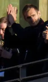 Hanson played in the 2013 Football League Cup Final; after the match, he said he believed Bradford City would return to Wembley via the League Two play-offs.[25] Hanson scored two goals in the next three League matches, reaching 10 goals for the season,[26] and later that month he stated that the club had to win both forthcoming Easter games.[27] In April 2013, Hanson spoke of the "buzz" around the club as they mounted a play-off challenge.[28] On 5 May, he scored a vital goal in the second leg of the play-off semi-final against Burton Albion, helping Bradford overcome a 3–2 deficit from the home leg to win the game 3–1 and the tie 5–4 on aggregate.[29][30] In the Final at Wembley, Hanson scored in a 3–0 victory against Northampton Town,[31] and later spoke about how he was looking forward to playing in a higher division.[32]