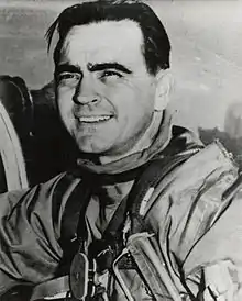 During the Korean War, Johnson commanded the 4th Fighter Interceptor Wing from November 1952 to August 1953, flying combat in an F-86 Sabre; it was from that plane that he received his nickname, "The Mayor of Sabre Jet City". On March 28, 1953, he became the war's 29th jet ace when he shot down his fifth MiG-15. After 86 missions and eight months of combat, he had destroyed ten enemy aircraft, damaged nine more, and had three probables, making him the first double jet ace wing commander.[2][3]