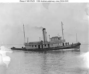 On 29 October 1918, the U.S. Navy acquired her under a bareboat charter, signed 3 November, from her owner, Mr. P. F. Martin of Philadelphia, for use during World War I. She never received a naval registry identification number, but was placed in service in the 4th Naval District as Arabian on 5 November 1918. Never being commissioned the tug was never authorized the prefix "United States Ship" (U.S.S.).[1][2]