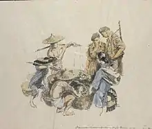 Morris worked as a miner in South Wales until 1929, when he moved to London, where he worked as a designer throughout the 1930s, including a spell as an interior designer for Harrods.[2] At the start of World War Two, he worked in civil defence for a brief period before joining the Royal Navy as a signaller. Morris served on Arctic convoy ships, including one that was shelled by the Tirpitz.[2] He sold drawings and a sketchbook depicting his experiences in Archangel and Murmansk to the War Artists' Advisory Committee, WAAC. In 1945, whilst still serving in the Navy, WAAC approved a full-time salaried contract for Morris, to record the work in the Far East of the British Pacific Fleet, alongside Leonard Rosoman. He worked in Rangoon after liberation, in Hong Kong, Formosa, Shanghai, Tokyo and Yokohama, making him the only full-time WAAC artist to reach China and Japan.[3] He recorded naval scenes aboard HMS Belfast and HMS Argonaut, cityscapes and war damage including works showing areas of Yokohama that had been extensively bombed. He recorded the interior of the imperial Diet in Tokyo and the post-war celebrations in Shanghai.[4][5]