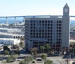 In January 1987, San Diego architect Homer Delawie, the senior partner of Delawie, Bretton, Wilkes and Associates presented his plan for the headquarters to the MTDB.[9][10] The 10-story building would straddle the 12th and Imperial station with trains passing through the lobby,[11] and the property would also include an iconic 200-foot clock tower and a 1,020-car parking garage that was envisioned as a place where people could park and ride the trolley to offices in the Downtown Core or events at the then-under construction San Diego Convention Center.[9] The building would be trimmed in red (the color of the San Diego Trolley) and the ground floor would contain 7,500 square feet of retail space.[11] The project was meant to play key role in plans to revitalize the East Village (also called Centre City East), a gritty neighborhood known for its dilapidated housing and aging businesses.[8]