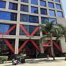 Close up of the James R. Mills Building showing the "San Diego Trolley red" accents and STO exterior