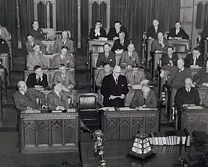 Ralston supported conscription for overseas service during World War II, and in 1942 offered to resign when prime minister William Lyon Mackenzie King's government would not introduce it.[1] The resignation issue was dropped, but after visiting Canadian troops in Europe in 1944, he argued again that conscription was necessary, and a schism developed in King's cabinet (see Conscription Crisis of 1944). King forced him to resign, replacing him with Andrew McNaughton on November 1, 1944.[1]