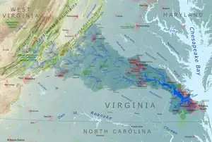 The James River is a river in Virginia that begins in the Appalachian Mountains and flows 348 miles (560 km)[3] to the Chesapeake Bay. The river length extends to 444 miles (715 km) if the Jackson River is included, the longer of its two headwaters.[3] It is the longest river in Virginia. Jamestown and Williamsburg, Virginia's first colonial capitals, and Richmond, Virginia's current capital, lie on the James River.