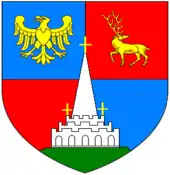- ↑ Arms as depicted in a 1794 stained glass image in Shute Church of the arms of George Templer of Shapwick. These differ in several details from the official grant of 1765 registered in the College of Arms: Quarterly azure and gules, on a mount in base vert the perspective of an antique temple argent of three stories, each embattled; from the second battlement two steeples, [sic] and from the top, one, each ending in a cross sable [sic] on the pinnacle; in the first quarter an eagle displayed; in the second a stag trippant regardant or.[1]
