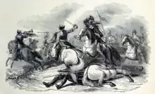 He appears, however, to have adopted the military profession at a very early period of life, and having distinguished himself in the parliamentary army was raised to the rank of lieutenant-colonel.[8][2] He went to Ireland in the Marquis of Argyle's regiment in the year 1642, and in 1645 was recalled to oppose the progress of the Marquis of Montrose. At what period of the straggle Colonel Wallace joined the army of the Covenanters under General Baillie is unknown, but he was at the Battle of Kilsyth, where he was taken prisoner.[7]