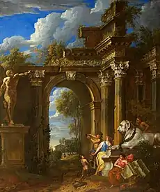 Jan Baptist Huysmans also painted architectural capricci, i.e. architectural fantasies, which place together buildings, archaeological ruins and other architectural elements in fictional and often fantastical combinations and may also include staffage (figures). An example is A ruined classical archway (National Trust, Dinton, Wiltshire), which shows ruins of a triumphal arch and the statue of the Borghese Gladiator. In the right foreground are also depicted satyrs and nymphs who are festooning an Egypto-Roman stone lion.[7]