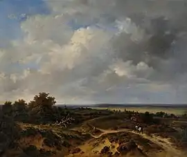 Later, he tried to reproduce his subjects more realistically and broke with the traditions of the conventional landscape.[3] In his Landscape in the environs of Tournai of 1836 (Royal Museums of Fine Arts of Belgium), the artist gave the horizon an important role as he opened up the space and the sky became the key element of the composition. This desire to open up the composition is a defining characteristic of his mature period.[8]