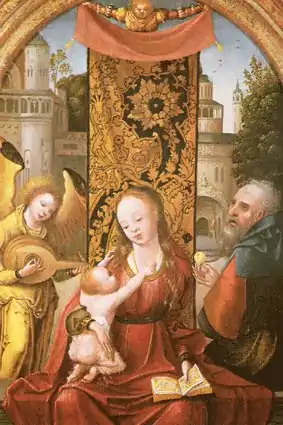 Jan Van Dornicke's painting of Madonna and Child, with St. Joseph and angel, oil on panel, 37.5 x 26.7 cm.