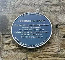 The Irish physician and inventor, William Reid Clanny, who had moved to nearby Sunderland, introduced Jane to Sir Robert Peat, a sycophantic chaplain of the Prince Regent. Peat was said to be supportive of a match with Jane to use her relationship (albeit distant) to the prince's unofficial wife, to further advance himself in royal favour and also to repay his gambling debts. Jane was taken with the idea of a title if she were to marry Peat, but was afraid to put her wealth at the disposal of a husband.[2][4] When Sir Robert proposed to Jane, he was heard to have said that she would never marry as long as Herrington House still stood.[2]