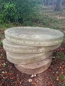 In 2009 a stone sculpture of four stacked stone discs, representing the hoarding of money, was installed in Herrington Park,[14] near the former site of Herrington House, with the words: