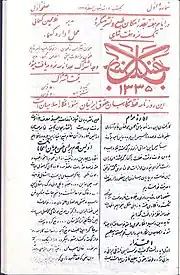 The periodical Jangal (Persian: جنگل; DMG: Ǧangal; English: "Forest") was founded in 1917 by the Nehzat-e Jangal (“Jangali-movement“, 1914–1921) in Gilan.[1] Mirza Kuchak Khan (1880/1882–December 1921), a young revolutionary and the founder and leader of this movement was fighting together with the Ettehad-e Eslam committee (“Islamic Unity“) in the forests of Northern Iran. Their movement was directed against – among others – large landowners as well as the exertion of influence coming from the British and Tsarist Russia. In June 1920, the Jangalis joined forces with the Communist Party of Iran and proclaimed the Socialist Republic of Gilan, which was re-conquered by Reza Khan Pahlavi (later: Reza Shah Pahlavi) in November 1921.[2] The journal was the mouthpiece of the Jangalis and partially published by Mirza Hoseyn Kasma’i (1862–1921). They spread their opinion and critique in 31 issues by means of literary texts and cultural symbolism.[3] They had many ideas in common with the nationalism of state elites: aspiring the compatibility of Islam, Iranian nationalism and socialism.[4]
