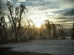The January 2007 North American ice storm was a severe ice storm that affected a large swath of North America from the Rio Grande Valley to New England and southeastern Canada, starting on January 11 and lasting until January 16. It was followed by a second wave in the Southern United States from Texas to the Carolinas from January 16 through January 18, and a third one that hit the southern Plains and mid-Atlantic states as well as Newfoundland and Labrador from January 19 to January 24. It resulted in at least 74 deaths across 12 U.S. states and three Canadian provinces, and caused hundreds of thousands of residents across the U.S. and Canada to lose electric power.[2][3]
