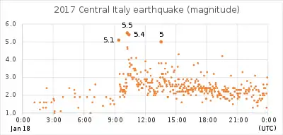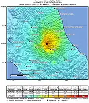 A magnitude 5.3 earthquake struck 25 km northwest of L'Aquila on 18 January at 10:25 local time at a depth of 9 km.[4] A stronger, 5.7 tremor hit the same epicentral area at 11:14 local time.[5] A third earthquake of preliminary magnitude of 5.6 struck 11 minutes later.[6] At 14:33 local time, the fourth tremor of magnitude 5.2 was registered.[7] These earthquakes were followed by multiple aftershocks.
