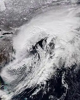 The January 2022 North American blizzard caused widespread and disruptive impacts to the Atlantic coast of North America from Delaware to Nova Scotia with as much as 2.5 feet (30 in) of snowfall, blizzard conditions and coastal flooding at the end of January 2022. Forming from the energy of a strong mid- to upper-level trough, the system developed into a low-pressure area off the Southeast United States on January 28. The system then quickly intensified that night as it traveled northeast parallel to the coast on January 29, bringing heavy snowfall blown by high winds to the East Coast of the continent. Further north, it also moved inland in Maine and its width meant it strongly impacted all three of Canada's Maritime provinces. In some areas, mainly the coastal regions of New Jersey, Long Island and Massachusetts, it was the first blizzard since a storm in January 2018.[3] The storm was considered a "bomb cyclone" as it rapidly intensified and barometric pressure dropped at least 24 millibars over a 24-hour period.[4] The storm was given names such as Blizzard of 2022 and Winter Storm Kenan.[5][6]