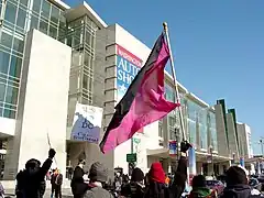 A black bloc, organized by Students for a Democratic Society, and advertised as a "radical youth bloc" on the DC Indymedia site,[2] met at Dupont Circle to begin a feeder march to the main rally site on the National Mall. The march from Dupont Circle to the Mall roughly followed the course of Massachusetts Avenue NW to its intersection with 7th Street NW near the Washington Convention Center. The march then followed 7th Street through Chinatown and the Penn Quarter neighborhood before reaching the Mall. The feeder march continued past the back of the mainstream rally on 7th Street, and onto Maryland Avenue SW, before briefly stopping at 3rd Street, at roughly the center line of the Mall.[3]
