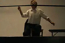 Later on performance art has become the main focus of Janusz Bałdyga's artistic activity. Over many years of practice, he has developed a unique style, characterized by the downsizing of the language and means of articulation by using simple elements to create elementary structures.[2] He says "Performance art, often combined with object, drawing or elements of installation art, constitutes the core of my artistic practice. Writing about performance art, I highlight its fundamental, yet often ignored, educational aspect. Performance is an open discipline, constantly revealing the process of its own creation, facing artists with strongly articulated self-education tasks."[6]