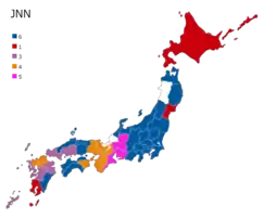 The Japan News Network (JNN; Japanese: ジャパン・ニュース・ネットワーク, romanized: Japan Nyūsu Nettowāku) is a Japanese commercial television network run by TBS Television, owned by TBS Holdings (which is a part of the major conglomerate Mitsui Group). The network's responsibility includes the syndication of national television news bulletins to its regional affiliates, and news exchange between the stations. Its affiliate stations also broadcast non-news programs originating from TBS Television. Founded on 1 August 1959,[1]: 150–151 JNN is made up of 28 full-time affiliates.