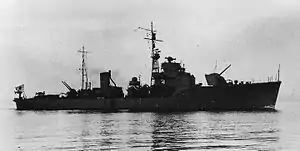 Around the evening of the same day, the news was unknown in the south of Kyushu and she was found sunk. The 33rd Kaibokan, which she was with, was also sunk by an air raid. According to US records such as The Official Chronology of the US Navy in World War II, the ship was sunk by a torpedo attack by the USS Threadfin on the same day.[20] At 16:45, the No. 33 Kaibokan discovered and reported an enemy aircraft, but Threadfin sank Mikura at this point according to American records. It is almost the same as the sinking point of the No. 33 Kaibokan described in The Official Chronology of the US Navy in World War II. In addition, Threadfin was sunk alone in Roscoe, and the 33rd Kaibokan was sunk by a USS Hornet aircraft.[21] Kimata's "Enemy Submarine Attack" and "History of the Battle of the Sea of Japan", War Diary of the 1st Escort Fleet (March 1-31 1945), War Diary of the 102nd Squadron (March 1-31 1945) ) did not mention that it was sunk by Threadfin, but in the section of the escort ship of Kaibokan Senki, as a witness of the 65th Kaibokan voyage chief, "I was attacked by an enemy task force's plane and submarine, 1200 Around that time, Mikura was sunk by the torpedo attack of an enemy submarine, and there were no survivors."[22] It is unclear in conclusion whether it was the Threadfin, the 58th Task Force, or the joint sink that really sank Mikura, but as mentioned above, at least Roscoe has recognized it as a joint battle result.