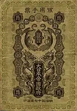 Japanese military currency (日本軍用手票) is the name given to money used by the Japanese armed forces for the purchase of supplies in occupied territories.[1] It was mainly issued in denominations of yen, and subsidiary currency of sen with the exception of the first Sino-Japanese War series. This particular article covers pre-Shōwa era currency issued from 1894 to 1918 in three different periods. During this time Japan was militarily involved in the First Sino-Japanese War, Russo-Japanese War, and events during World War I such as the Siberian intervention. The military currency issued during these events circulated in Japanese Korea, the Republic of China (Manchuria), and the Russian State. All of the notes issued share a similar design which resembles government issued civilian currency which circulated in Japan from 1872 to 1899. Japanese military currency was exchangeable at the given time for both silver and gold bullion. Most of these events were not long term which impacted the amount of surviving currency in different ways. It was also routine after each event for officials to exchange the military currency issued for bullion or other forms of payment such as banknotes. Unredeemed notes were thus either held by the public as commemorates or eventually lost in the decades that followed. Those that remain today are collected and traded depending on the condition and surviving rate of the series.