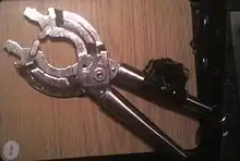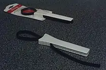 A traditional jar opener for a screw-off lid will have two handles, leading up to two concentric grooved rings which can be used to fit different lids. It also sometimes has a device to open a bottle on it. There are many models including rubber sheet grip models and rubber timing belt loop models.[1]