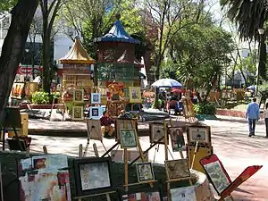 This outdoor art gallery was established in 1955 in order to give young and unknown artists a chance to show and sell their work. This is still the case today.[4][5] One of the latter is Jorge Espinosa Carrizales, who has been selling here for over forty years. A number of artists give classes in the market itself in painting, sculpture and even violin, which were given by Espinoza Carrizales at the Serapio Rendón corner of the park. Other longtime artists include Roberto Ulises, Marco Antonio Zepeda, Reynaldo Torres and Armando Anguiano.[5] A number of artists from here have been recruited by national and international galleries and other venues, including the Sistema Nacional de Creadores de Arte .[4][5]
