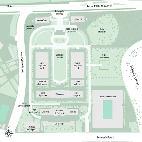 The Jardin des Serres d'Auteuil (French pronunciation: [ʒaʁdɛ̃ de sɛʁ dotœj], literally 'Garden of the Greenhouses of Auteuil') is a botanical garden set within a major greenhouse complex located at the southern edge of the Bois de Boulogne in the 16th arrondissement, with entry at 1 avenue Gordon-Bennett, Paris, France.