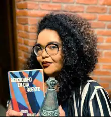 Arraes also published an anthology of poems called O golpe de 2016. The work, done in 19 cordel illustrations, recounted the impeachment of then-president Dilma Rousseff.[17] A poet engaged with the Sociedade dos Poetas Malditos, she used the artistic field to make tools for creating social consciousness.[18] In October 2018, Arraes' book As Lendas de Dandara was translated into French and released in France by publisher Anacaona under the title Dandara et les esclaves libre.[19] She had a launch tour in French cities and participated in events in Paris, at the Maison de l'Amérique latine, as well as in Rennes, in La Rochelle at the Musée du Nouveau Monde, and in Lille, at the Le Bateau, along with having visited various schools and universities.[6] In July 2019, she launched her first book of tales through the publisher Alfaguara (Companhia das Letras), Redemoinho em dia quente, in which she introspects on her Cariri ancestry.[20] The first launched occurred during that year's FLIP, of which she was an invited guest.[21] The book was award Best Book of Tales and Chronicles of 2019 by the Associação Paulista de Críticos de Arte (APCA).[22] She has been awarded other honors, including the Biblioteca Nacional prize and the Suplento Pernambuco prize for her works.[23]