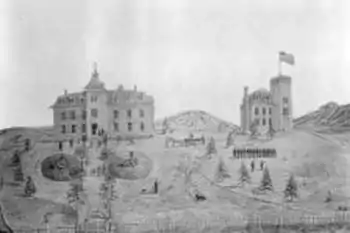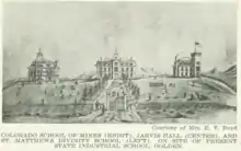 The first Jarvis Hall building under construction in Golden, Colorado, was blown down by an 1869 windstorm,[3] on land donated by C. C. Welch. Jarvis provided funding for construction of a second Jarvis Hall building which was dedicated in October 1870. It was Colorado Territory's first collegiate institute. Two other buildings were added to what was called the Colorado University Schools, which School of Mines and St. Matthew Divinity, an Episcopalian seminary, flanked the central Jarvis Hall.[4][3] Jarvis donated and solicited donation of books for the Jarvis Hall Library. Annual prizes were awarded at the school year end, funded and chosen by Jarvis. In July 1873, three students won multiple volume sets of the History of Rome, Tyndale's Lectures and Library of Wonders.[4]