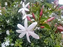 Jasminium dichotomum, the Gold Coast jasmine, is a species of jasmine, in the family Oleaceae. It is an evergreen climber which grows as a rambling shrub or woody vine. The flowers are quite fragrant and open at night, coloured pink when budding then white; these appear at the leaf axils in cluster. It blooms year round. The leaves are opposite. The fleshy fruit is small.[2]