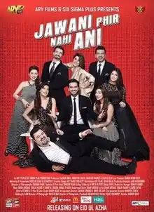 Jawani Phir Nahi Ani (lit.'Youth won't come again'), sometimes abbreviated as JPNA is a 2015 Pakistani adventure comedy film directed by Nadeem Baig. It was co-produced by Humayun Saeed, Salman Iqbal and Shahzad Nasib at Saeed's production house, Six Sigma Plus. It is the first installment in the Jawani Phir Nahi Ani film series, The film stars Humayun Saeed, Hamza Ali Abbasi, Ahmad Ali Butt, Vasay Chaudhry and Mehwish Hayat.[2][3] The supporting cast includes Sohai Ali Abro, Jawed Sheikh, Ismail Tara, Bushra Ansari, Ayesha Khan, Sarwat Gillani and Uzma Khan. The film is about a single man who is a divorce lawyer. He takes his three married friends on a trip to help them escape their wives and the monotony of their lives.