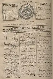 The Jawi Peranakan (Jawi: جاوي ڤرانقن) is an ethnic group found primarily within the Malaysian state of Penang and in Singapore, both regions were part of the historical Straits Settlements where their culture and history is centred around. The term "Jawi Peranakan" refers to locally born, Malay-speaking Muslims of mixed Indian and Malay ancestry. Over time, this has grown to include people with Arab ancestry as well.[1] They were an elite group within the British Malayan community in mid-19th century Malaya. In addition to their substantial wealth and social standing, they are remembered for setting up the first Malay newspaper in Malaysia, Singapore, Indonesia and China, the Jawi Peranakan and their influences on Malay culture.[2][3]