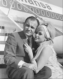 In 1967, film critic and exploitation movie expert Whitney Williams wrote of Mansfield in Variety: "her personal life out-rivaled any of the roles she played".[156] Mansfield was allegedly intimately involved with many men, including Claude Terrail (owner of the Paris restaurant Tour d'Argent),[157] Robert F. Kennedy,[158] John F. Kennedy,[159] Brazilian billionaire Jorge Guinle,[160] her attorney Samuel S. Brody, Las Vegas entertainer Nelson Sardelli, and producer Enrico Bomba. She met John F. Kennedy through his brother-in-law Peter Lawford in Palm Springs, California, in 1960, but their alleged affair did not last.[161][162][163] Mansfield and Brody, her lawyer and alleged lover at the time, were both killed in a car crash.[164][165]