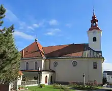 The church in Ježica is dedicated to Saint Cantius and Companions[16] and was built on the site of a medieval predecessor mentioned in written records in 1526. The new church was built from 1792 to 1802, and an east addition was built in 1938 based on plans by the architect Vinko Glanz (1902–1977). The painting of the Holy Cross is an 1802 work by Andreas Herrlein (1739–1837), the Stations of the Cross are the work of Leopold Layer (1752–1828), the pulpit painting by Mirko Šubic (1900–1976), and the mosaic by Stane Kregar (1905–1973). The main altar was designed by the architect Ciril Zazula (1924–1995) and the side altars by Janko Omahen (1898–1980).[1] Ježica was originally part of the proto-parish of Saint Peter in Ljubljana.[6]: 349 It became a quasi-parish in 1787 and was elevated to a parish in 1850. There is an old wayside shrine below the church.[1]