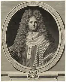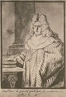 Portrait by Hyacinthe Rigaud engraved by Pierre Drevet. Note his attire as président à mortier: robe and striped ermine epitoge.