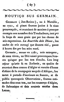 Jean-Baptiste Germain (in Occitan Joan Baptista Germain) was an 18th-century Occitan writer from Provence. He was also a French diplomat in Algeria at the service of the Compagnie Royale d'Afrique.